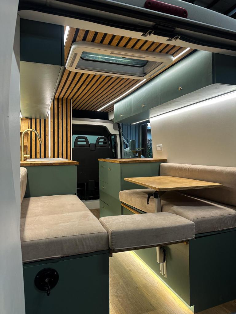 doccia, gabinetto, tavolo, cucina, letto, frigorifero, un ampio lavandino e tantissimo spazio per lo stivaggio, mantenendo i tre posti viaggio! Il letto è in coda e non è fisso, smontando il tavolo Lagoon si ottiene il letto.